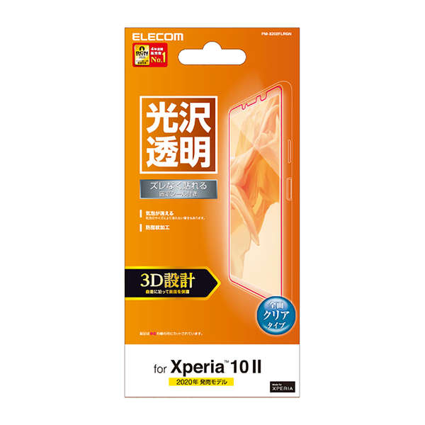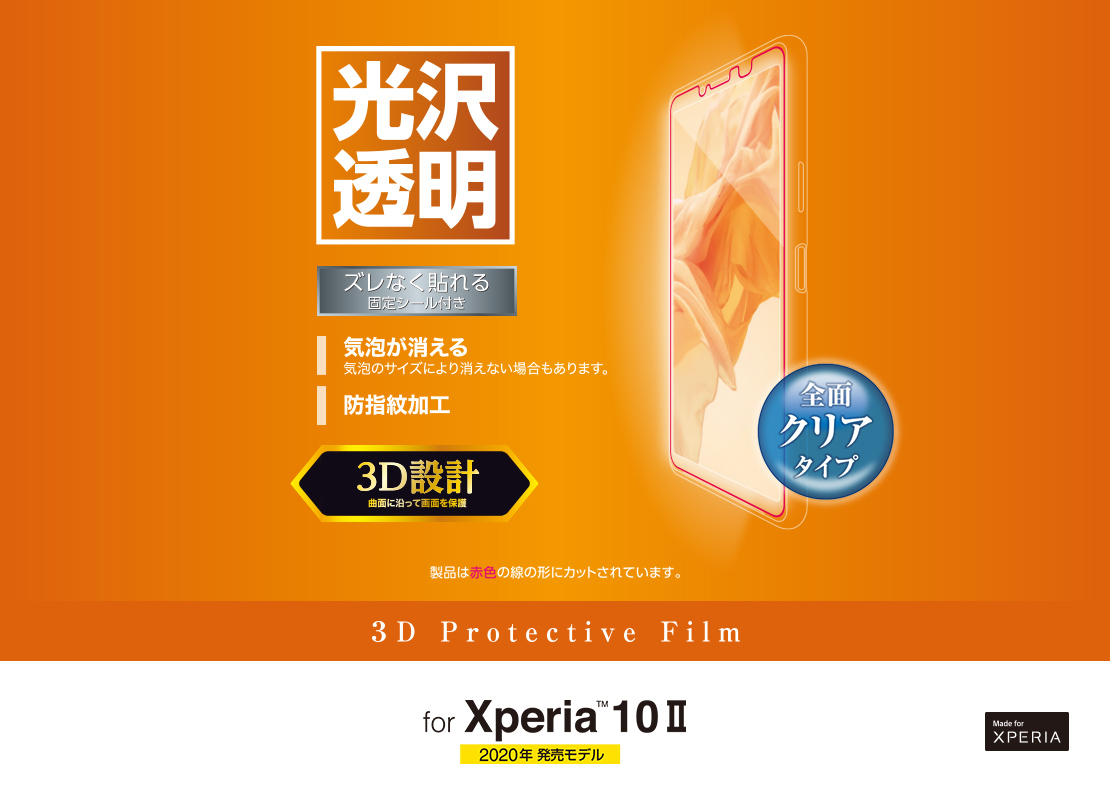 液晶画面を3D設計で保護します。専用ヘラ付きで貼りつけやすく、液晶画面をしっかり守る高光沢タイプのXperia 10 II用液晶保護フィルムです。