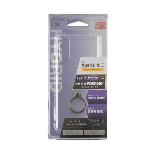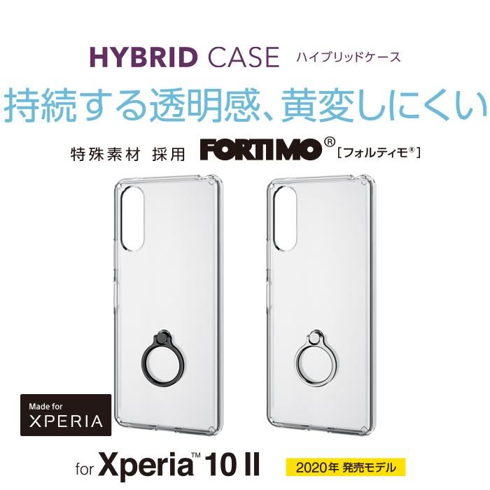 ポリカーボネートと高弾性・無黄変性に優れた三井化学(株)製「フォルティモ(R)/TPU(熱可塑性ポリウレタン)」、2つの素材を使用したXperia 10 II用リング付耐衝撃ハイブリッドケースです。
