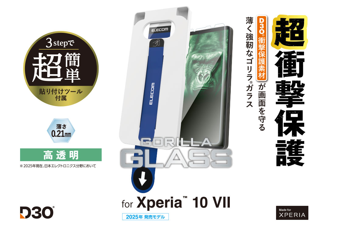ミリタリーやモータースポーツで採用されている次世代の衝撃保護テクノロジーD3O(R)を衝撃吸収層に採用し、衝撃から画面を守ります。Gorilla(R)ガラスを採用した薄型仕様、高透明タイプの画面保護ガラスフィルムです。 端末に被せて、テープを引くだけ、ぴったり位置合わせできる超簡単貼り付けツール付きです。