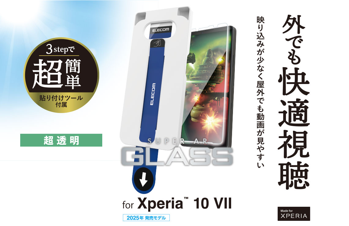 スーパーAR加工により透過率をアップ。動画視聴の際などに光の映り込みに邪魔されずに視聴することができる超透明タイプの画面保護ガラスフィルムです。 端末に被せて、テープを引くだけ、ぴったり位置合わせできる超簡単貼り付けツール付きです。