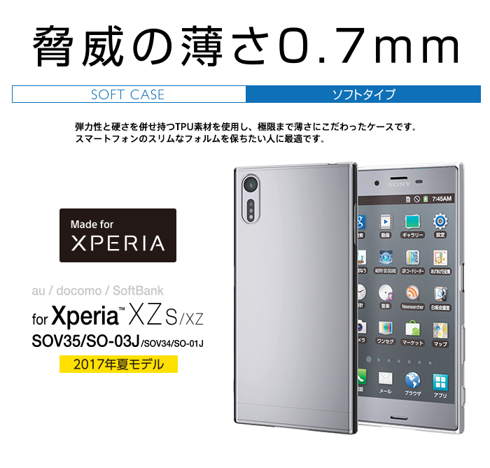 強じんな耐久性としなやかな弾力性を合わせ持ったTPU(熱可塑性ポリウレタン)素材を使用した、本体デザインが美しく際立つXperia (TM) XZs / Xperia (TM) XZ用極薄ソフトケースです。