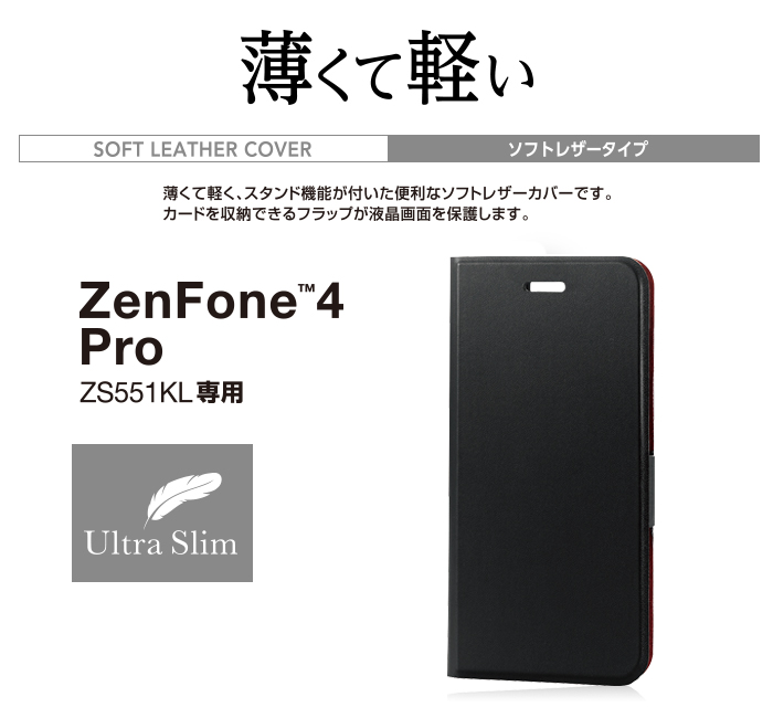 本体の薄さ、軽さを損ねない薄型・超軽量なウルトラスリムタイプのZenFone 4 Pro用ソフトレザーカバー(手帳型)です。