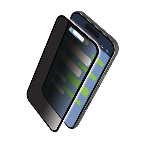3D設計のPETフレームと二次強化で角割れを防ぎ、左右からの視界を制御する、のぞき見防止タイプの画面保護ガラスフィルムです。ぴったり位置合わせできる貼り付けツール付きです。
