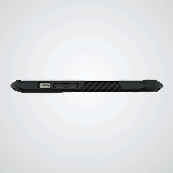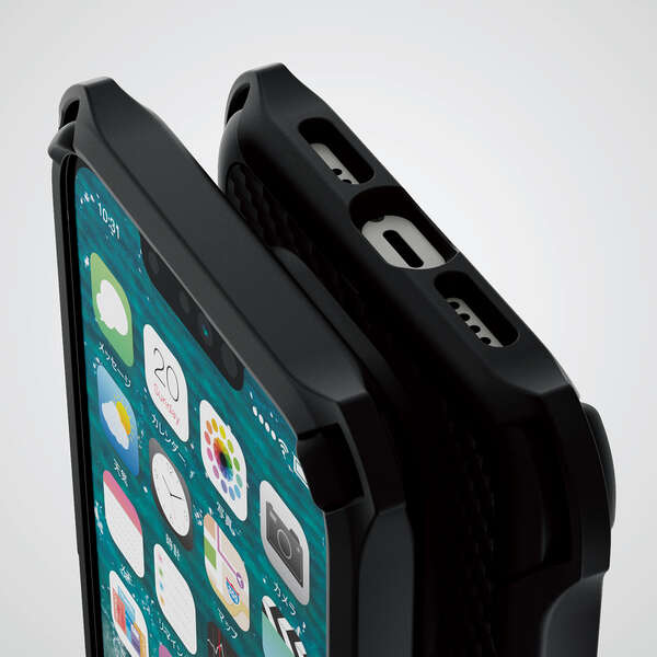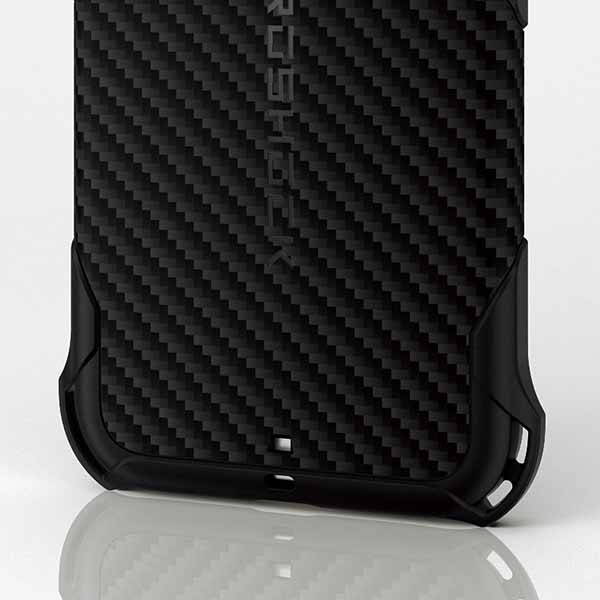 ケース背面から側面にかけてカーボン調のグリップテクスチャを施すことで、滑りにくくし持ちやすさを向上しています。