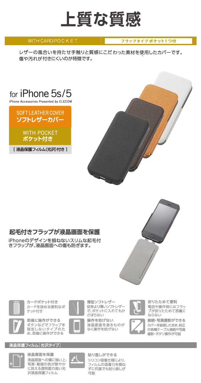当社従来品の半分以下の薄さを実現したスタイリッシュモデル!今までにないスリムスタイルを実現した薄型のiPhone 5/5s用ソフトレザーカバー。