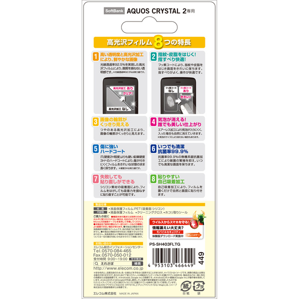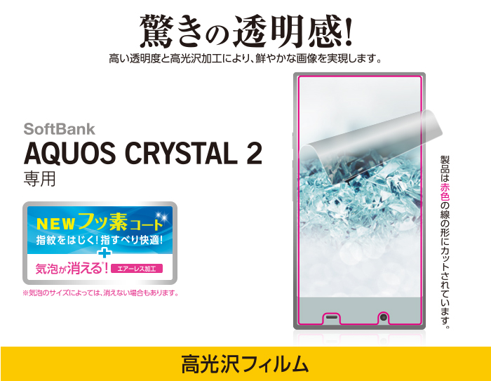 - AQUOS CRYSTAL 2 / AQUOS CRYSTAL Y2(403SH)の液晶画面をキズや汚れから守る、高光沢タイプの液晶保護フィルムです。