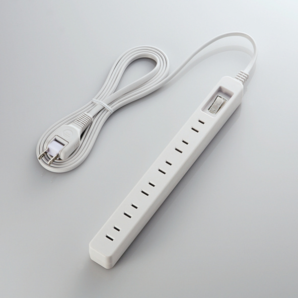接続機器の待機電流をまとめてカットできる!2P式6個口の省エネタップ。機器類をまとめてON/OFFできる一括スイッチ付き。スッキリと配線できるスイングプラグ採用。