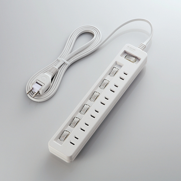 接続機器の待機電流を、個別でもまとめてでもカットできる!2P式6個口の省エネタップ。機器類を個別にON/OFFできる個別スイッチと、まとめてON/OFFできる一括スイッチ付き。スッキリと配線できるスイングプラグ採用。