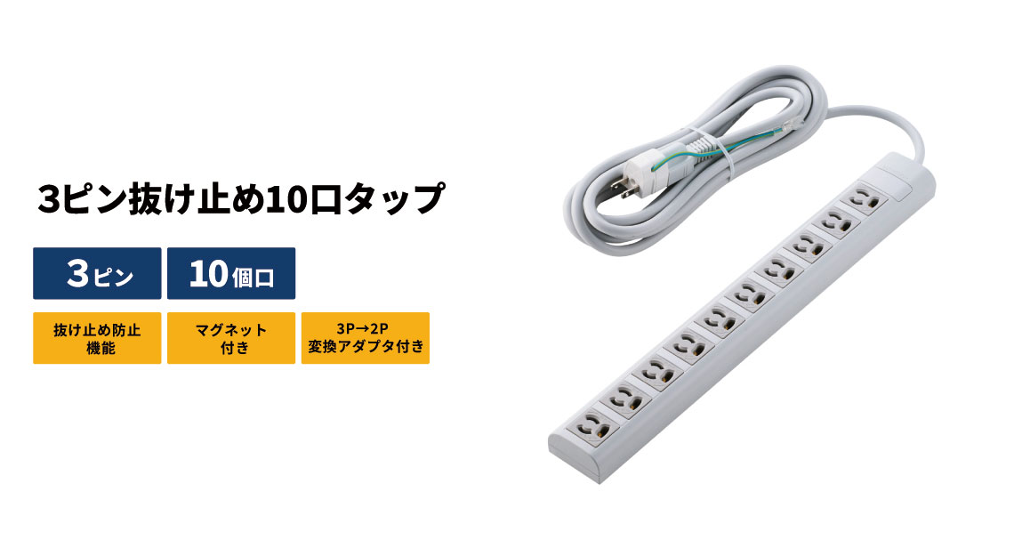 プロジェクターやモニターなどの3ピンプラグ機器を、アダプターなしで接続できる3ピンプラグ対応タップです。抜け止め機能付きの差込口を10口備え、設置に便利な仮固定用マグネット、丈夫なキャブタイヤコードを搭載。3ピン-2ピン変換アダプター(アース線付き)が付属しています。