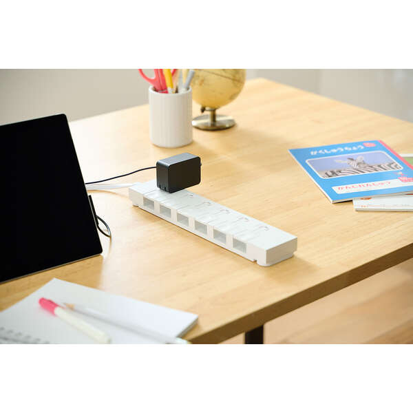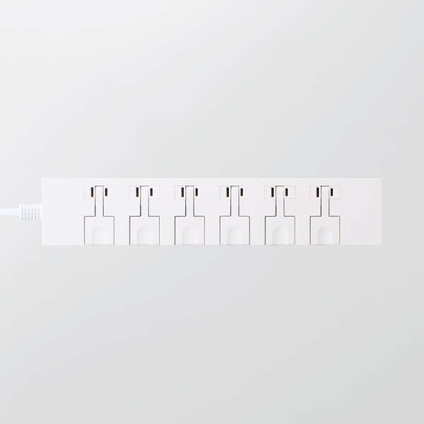 レバーを押すだけで簡単に、片手でプラグを抜ける6個口のタップです。タップを手で押さえたりプラグを強い力で引き抜いたりする必要はありません。