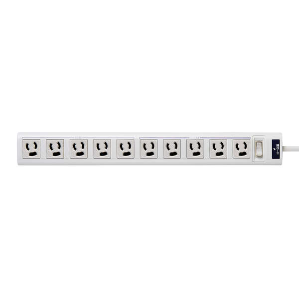 電源状態が一目でわかる点灯式一括スイッチを備えています。10口のうちコード側の5口はスイッチによるON/OFFができ、残り5口は常時通電するので、使用機器に合わせた差込口の使い分けが可能です。