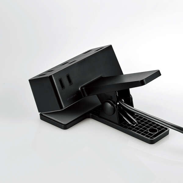 机などに挟んで使えるクリップ機構を搭載した、USB-Aポート付きの電源タップです。