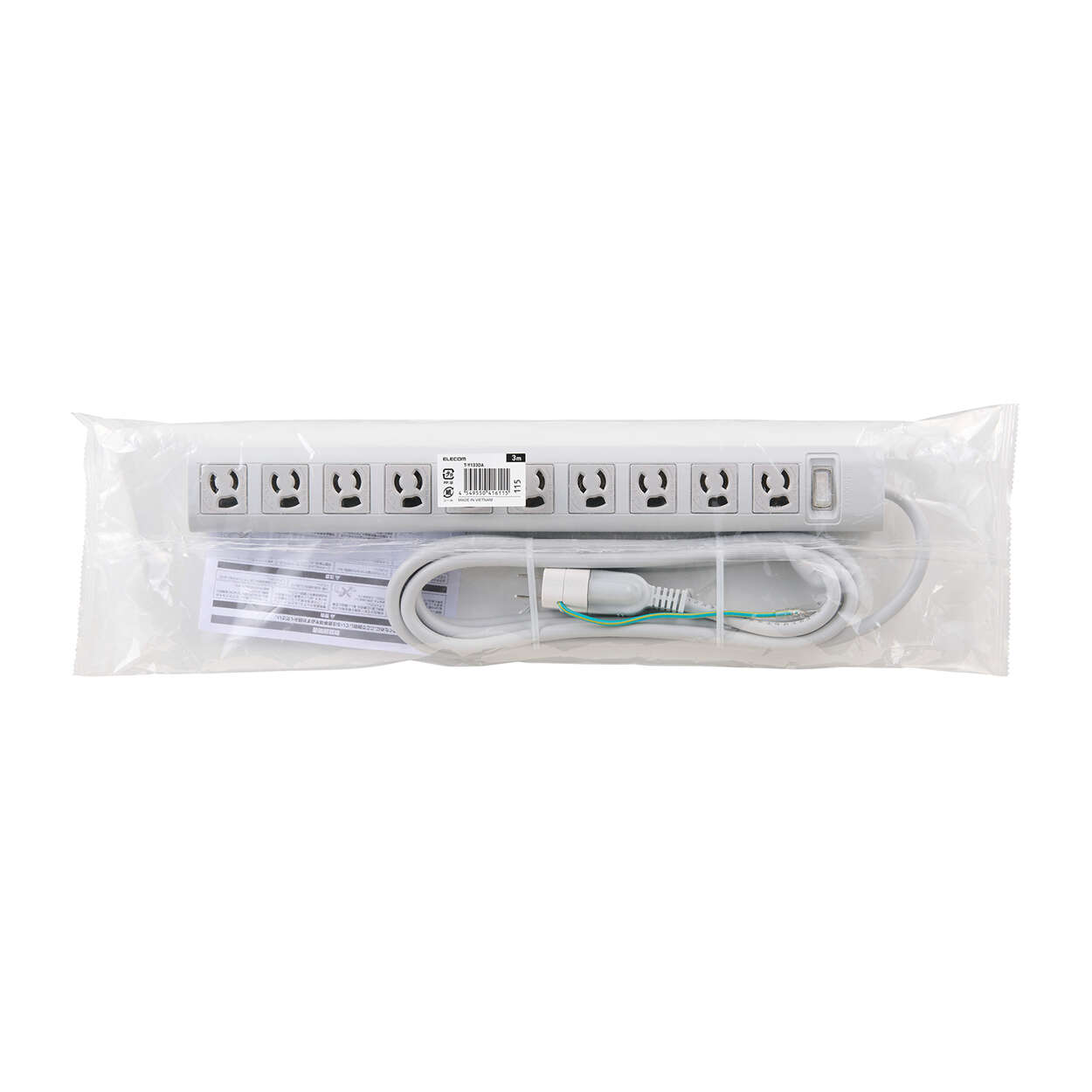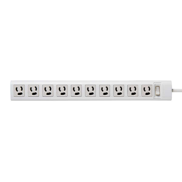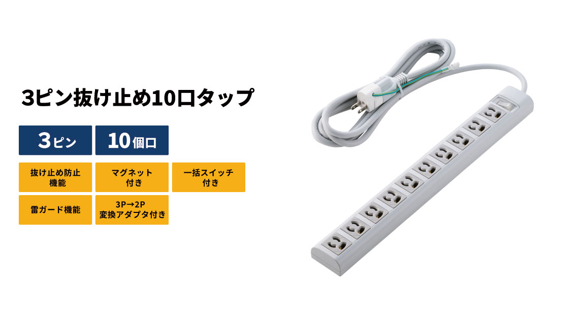 プラグと差込口はそれぞれ3ピン接続の構成で、10口ある差込口には抜け止め機能を備えています。