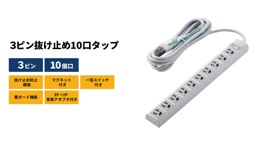 プラグと差込口はそれぞれ3ピン接続の構成で、10口ある差込口には抜け止め機能を備えています。