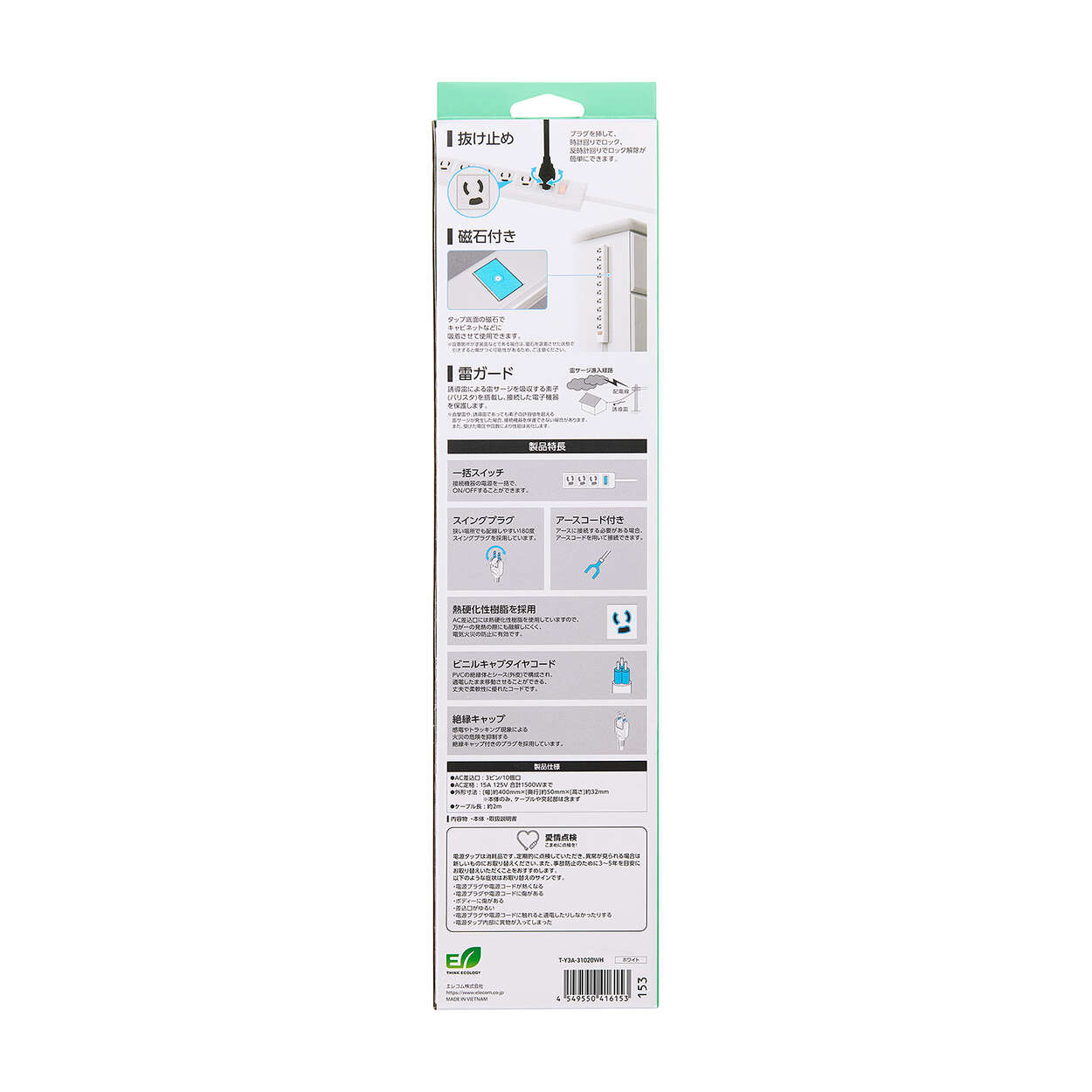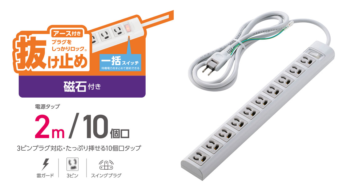 プロジェクターやモニターなどの3ピンプラグ機器を、アダプターなしで接続できる3ピンプラグ対応タップです。抜け止め機能付きの差込口を10口備え、設置に便利な仮固定用マグネット、狭い場所でも配線しやすい2ピンのスイングプラグ、点灯式一括スイッチ、設置に便利な仮固定用マグネットを搭載。雷ガード機能と丈夫なキャブタイヤコードにより、安全に使用できます。