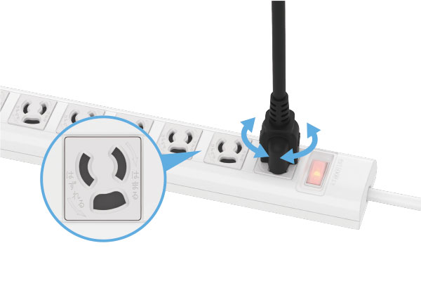 10口ある3ピン対応の差込口には抜け止め機能を備えており、プラグを差込口に挿入した状態から少しひねるだけで、簡単にロックと解除の切り替えができます。ロックすることでプラグの意図せぬ抜け落ちを防止できます。
