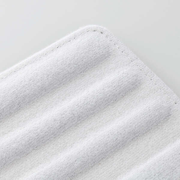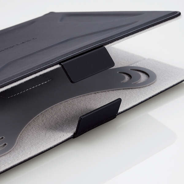フラップには、尖った物がケースに当たってもタブレットの画面を守る硬めの芯材を採用しています。また反発弾性が非常に小さい(ゆっくり沈んで、ゆっくり戻る)低反発ポリウレタンを採用し、衝撃を効果的に吸収します。