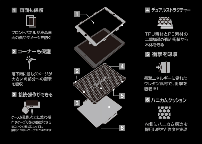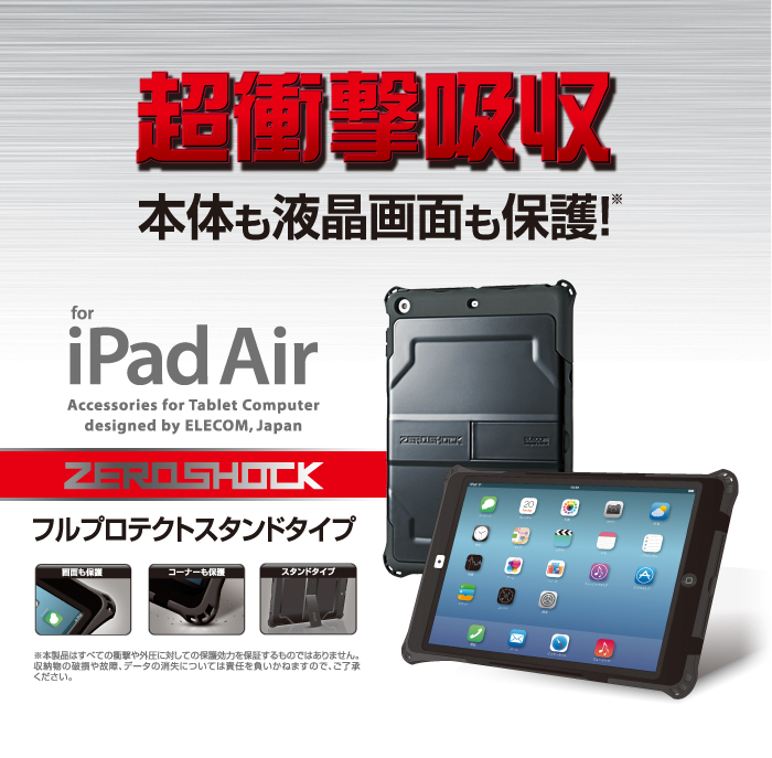 超衝撃吸収でiPad Air 2013年モデルをがっちり守る。本体も液晶画面も保護するiPad Air 2013年モデル用Zeroshock Hardケース。