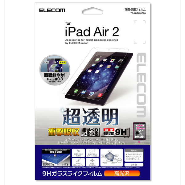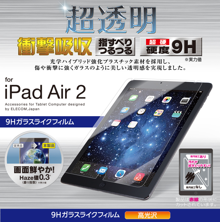 - iPad Air 2の液晶画面を守る、傷や衝撃に強く、ガラスのように美しい透明感を実現した9Hタイプの高光沢液晶保護フィルム“9Hガラスライクフィルム”です。