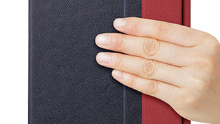 未使用時に液晶画面部分をカバーするフラップが付いています。フラップを閉じるとスリープモードになり、開けるとスリープから復帰します。カバー内側にはカバー外側に合わせたアクセントカラーを採用しています。