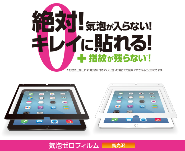 • iPad Proの液晶画面を傷や汚れから守る、接着面の気泡ゼロ加工により気泡を発生させず、誰でもキレイに貼れる、皮脂汚れ防止・高光沢タイプの気泡ゼロフィルムです。