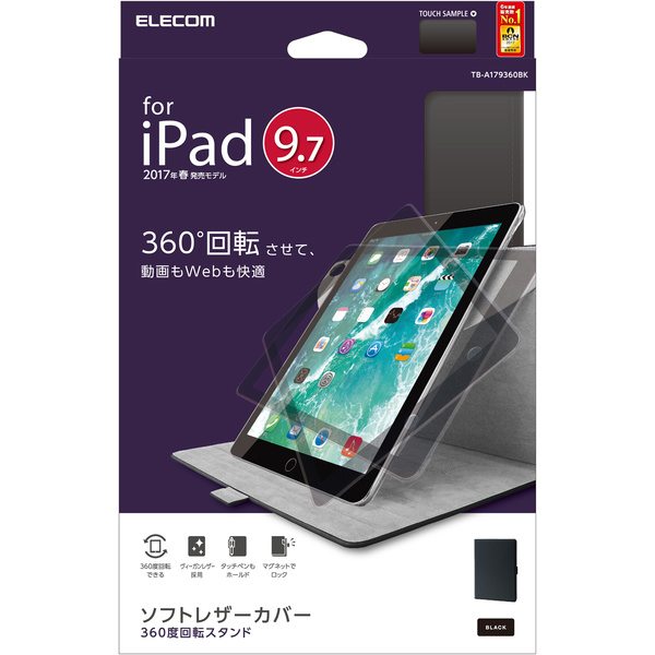 360度回転でき、縦向き、横向きのお好きな角度で使用できる9.7インチiPad 2018年モデル、2017年モデル用ソフトレザーカバーです。