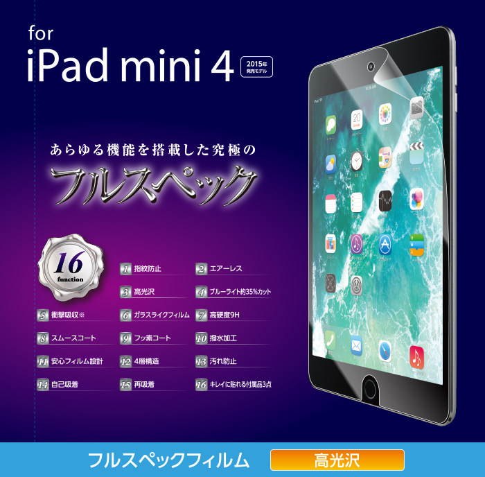 - あらゆる機能を搭載した究極のフルスペック! 表面硬度9H、衝撃吸収、ブルーライトカット、防指紋の高機能が1枚に集約されたiPad mini 2019年モデル、iPad mini 4用多機能フィルムです。