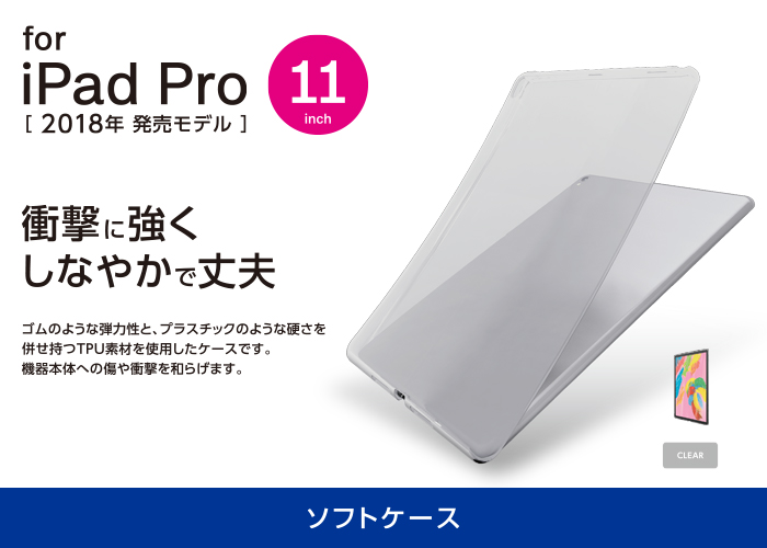 傷や汚れから守り、強じんでしなやかなTPU(熱可塑性ポリウレタン)素材を使用したiPad Pro 11インチ 2018年モデル用ソフトケースです。
