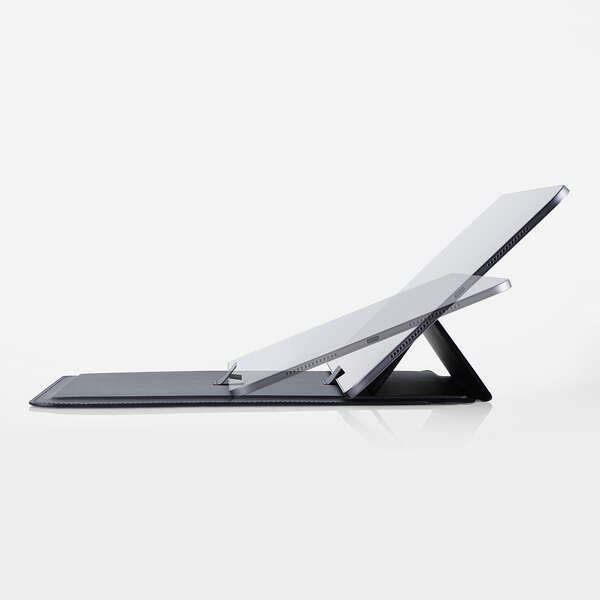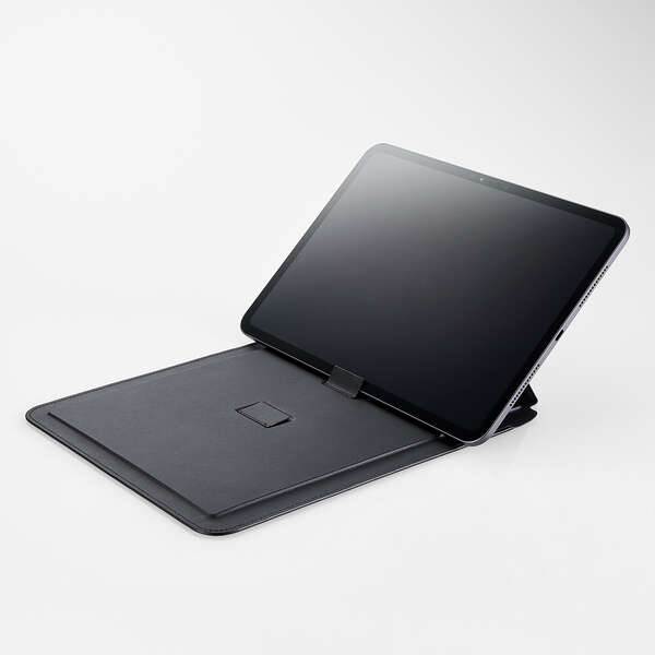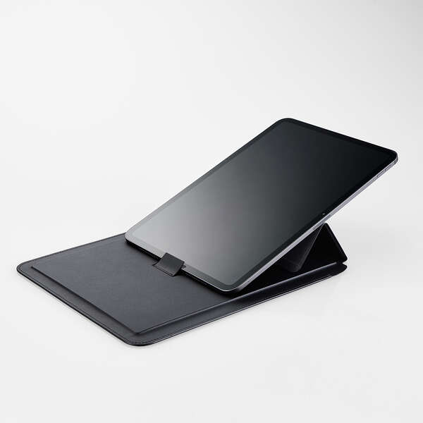 傷や汚れから守るフラップ付きスリップインソフトレザーポーチです。マグネットロック式でiPadの落下を防ぎます。シーンに合わせて縦横自由に置けるスタンド付きです。