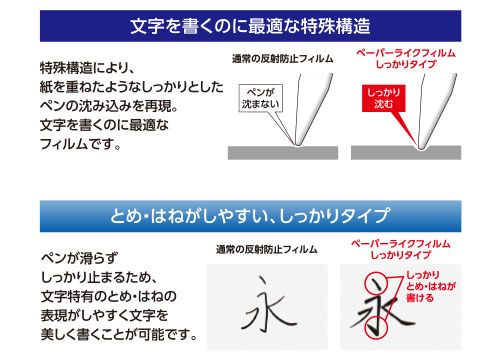 • 特殊構造により、しっかりとしたペンの沈み込みを実感できる「文字を書く」ことにこだわった画面保護フィルムです。