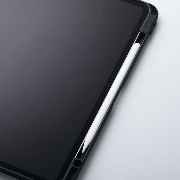 前面のタッチペンホルダーにApple Pencilを差し込んで持ち運び可能です。