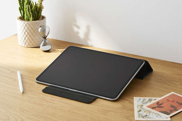 フラップカバーを三つ折りにすることで、動画視聴と、ドローイング・タイピングに最適な2通りの角度で使用できます。