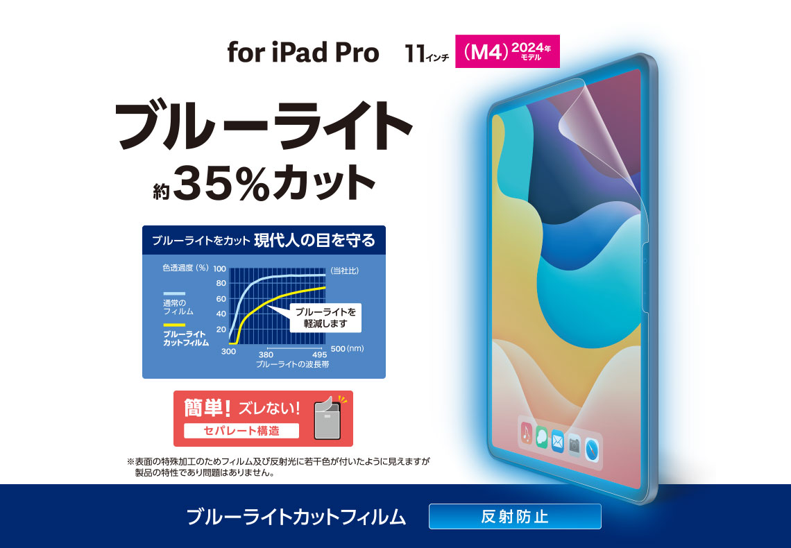 • 画面を見続ける機会が多い現代人の目を考えて開発。画面が発する光の中の青い部分「ブルーライト」を大幅にカットする、反射防止タイプの画面保護フィルムです。