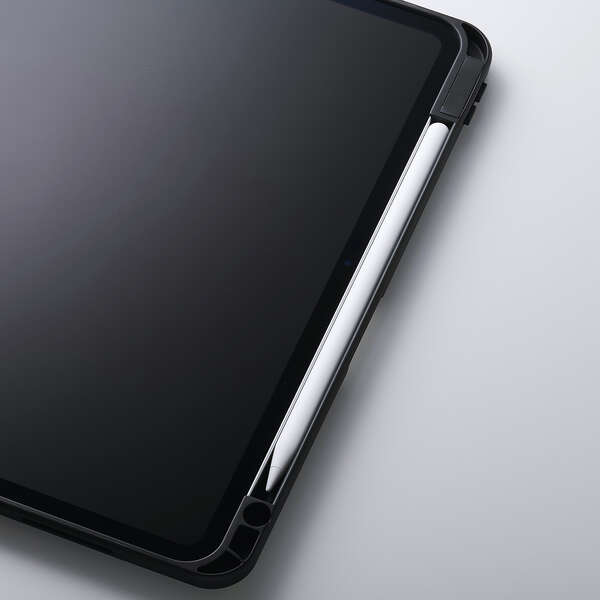 前面のタッチペンホルダーにApple Pencilを差し込んで持ち運び可能です。