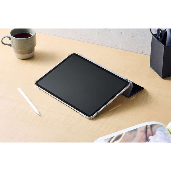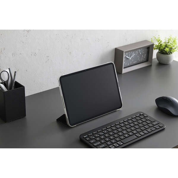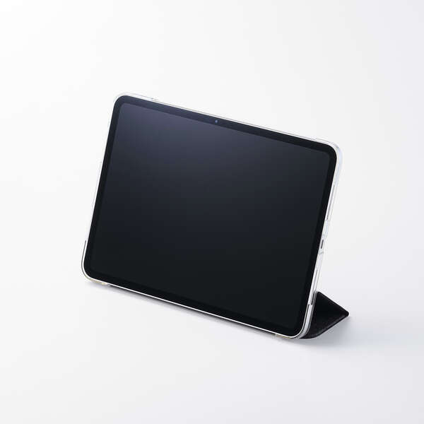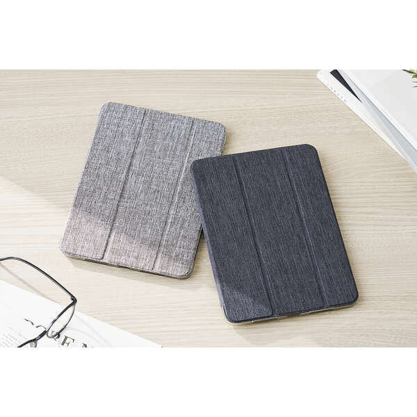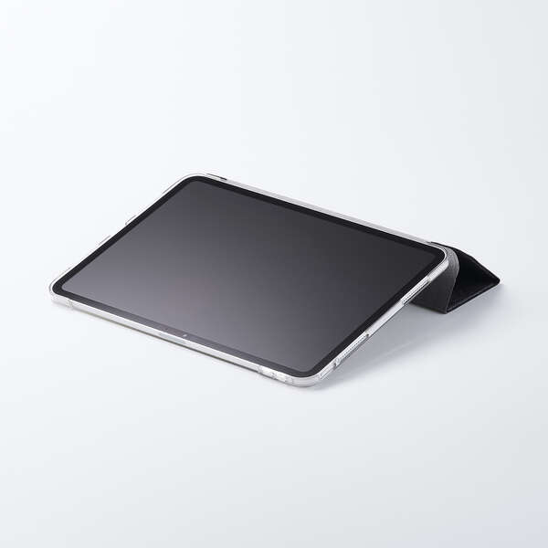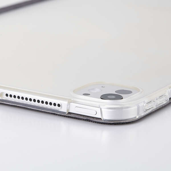 どんなシーンにも使いやすいファブリック生地を採用!軽さを重視する人におすすめの極限まで薄さにこだわったフラップケースです。シーンに合わせて2アングルにできます。端末の背面が見えるクリア素材を採用しています。