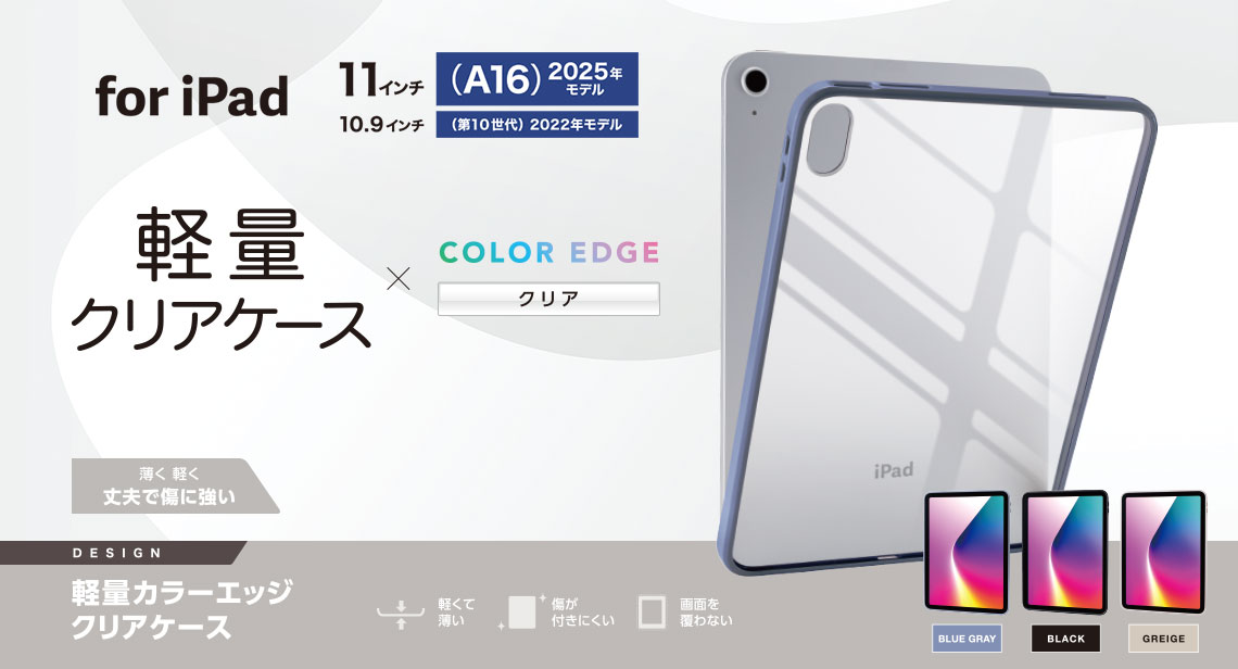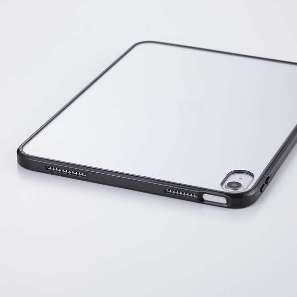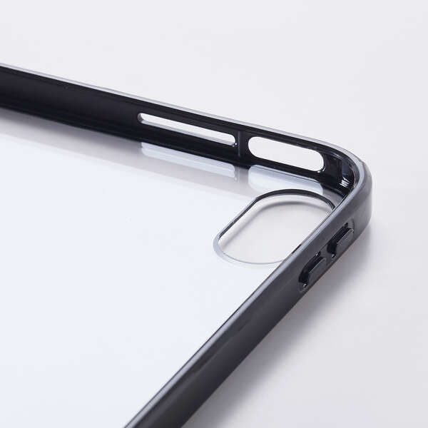 エッジ部分のカラーがアクセントとなる軽く、衝撃に強いクリアケースです。背面は透明感と艶が美しいクリア素材を採用。側面に弾力性のあるTPU素材を、背面に指紋が付きにくいポリカーボネート素材を使用しました。