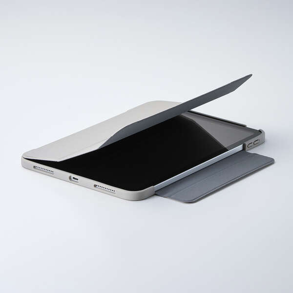 持ち歩き時に画面を保護するフラップ付きです。フラップを閉じるとスリープモードになり、開けるとスリープから復帰します。