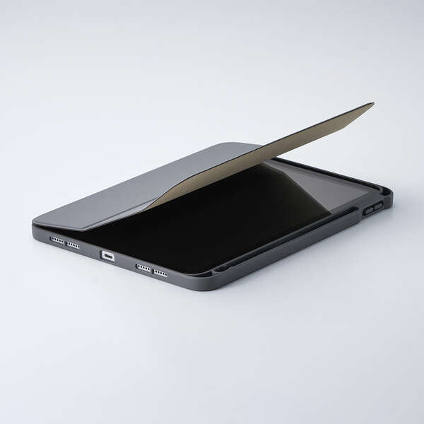 持ち歩き時に画面を保護するフラップ付きです。フラップを閉じるとスリープモードになり、開けるとスリープから復帰します。