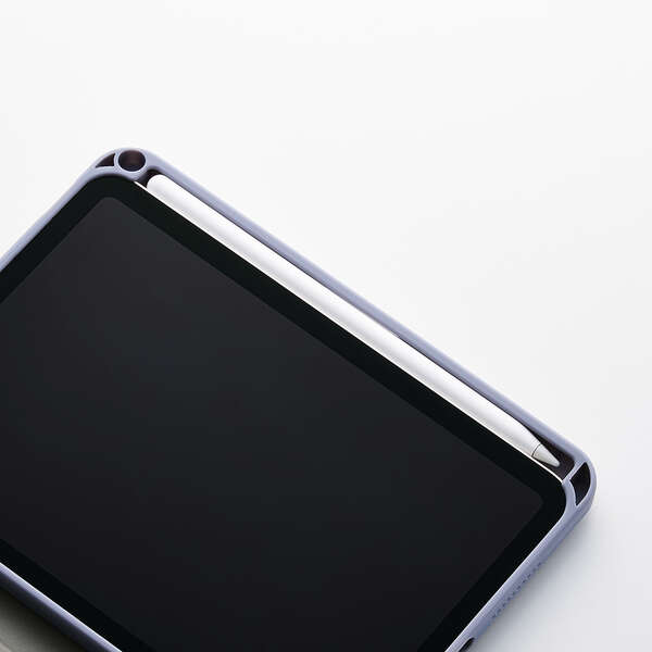前面のタッチペンホルダーにApple Pencilを差し込んで持ち運び可能です。