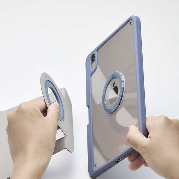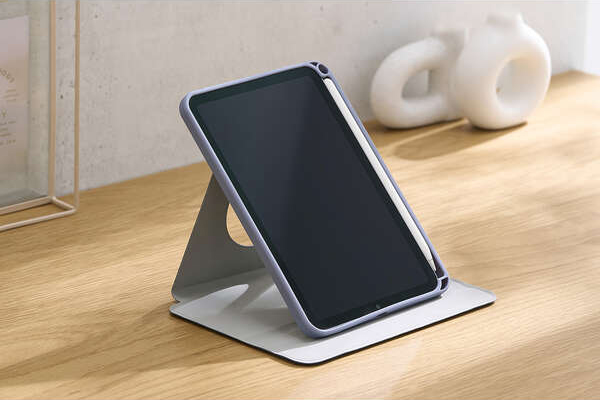 マグネット固定部で360度回転ができ、端末を縦置きでWeb閲覧に、横置きで動画視聴に最適です。