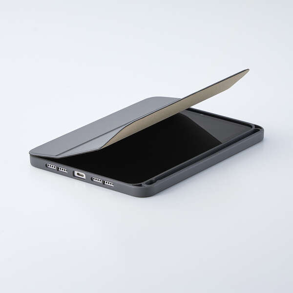 持ち歩き時に画面を保護するフラップ付きです。フラップを閉じるとスリープモードになり、開けるとスリープから復帰します。