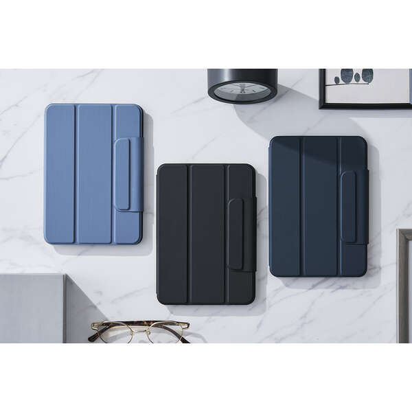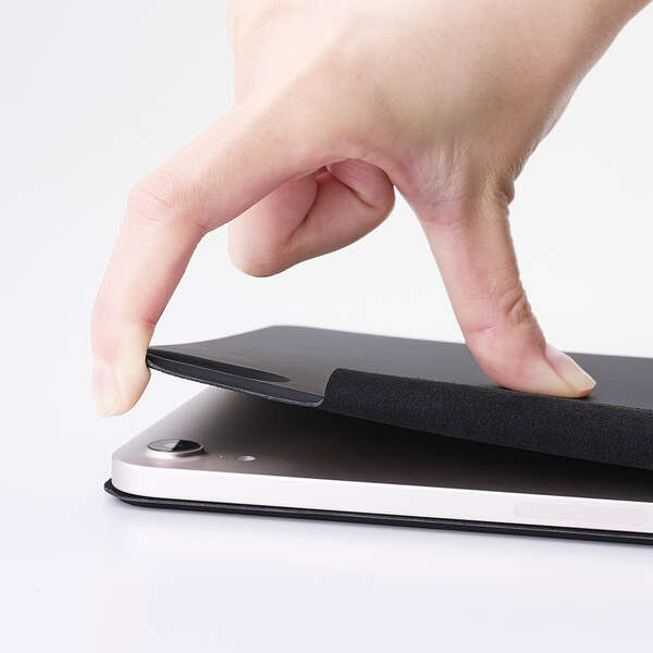端末本体に内蔵されたマグネットを利用して、簡単に着脱できる超薄型・軽量設計のフラップケースです。動画視聴やタイピング等のシーンに合わせて2アングルにできます。
