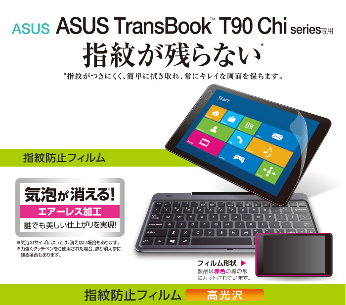 - ASUS TransBook T90Chiの液晶画面を傷や汚れから守る、指紋防止・高光沢タイプの液晶保護フィルムです。