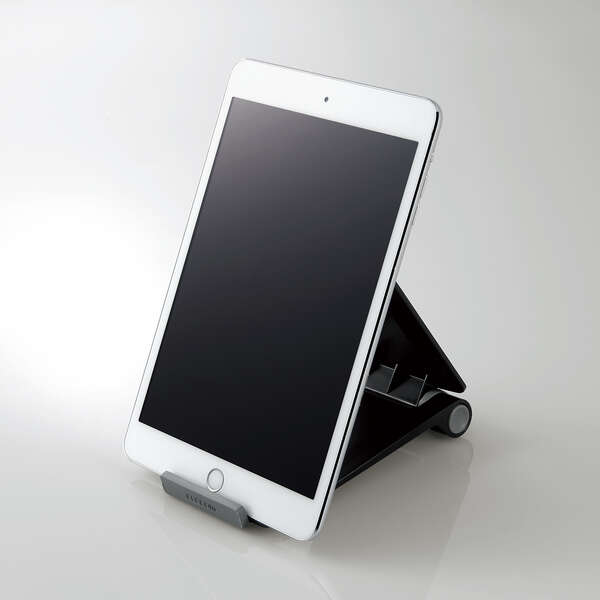 お手ごろ価格で折りたたんでコンパクトに持ち運びできる、樹脂素材のタブレット用コンパクトスタンドです。