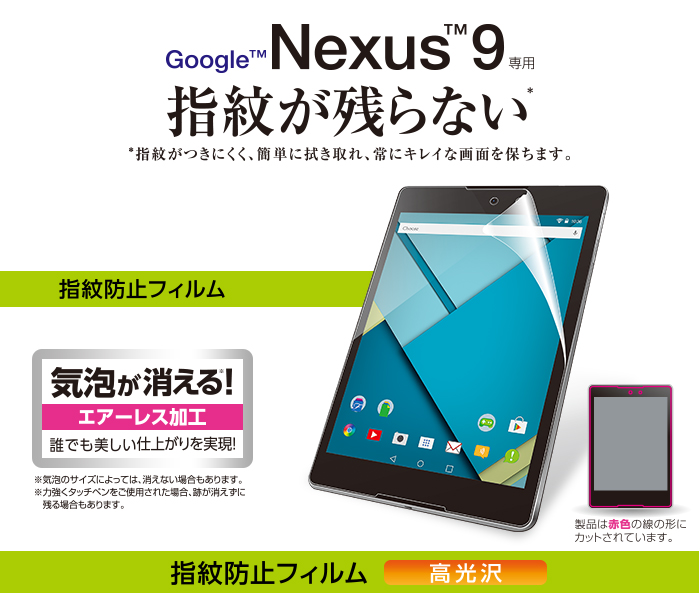 気泡がキレイに抜けるエアーレスタイプ。Nexus 9の液晶画面をキズや汚れから守る、防指紋タイプの液晶保護フィルム。