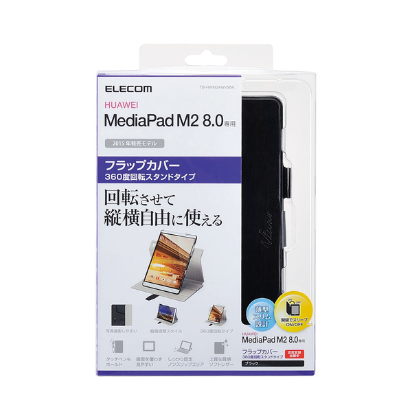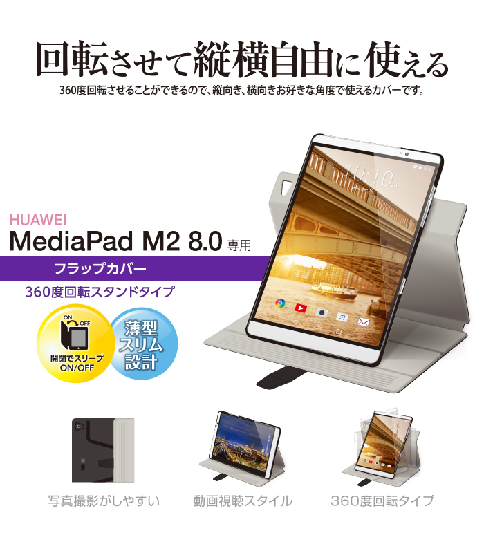 縦向き、横向きのお好きな角度で使用できる、スリムなスタイルを実現したHuawei MediaPad M2 8.0用フラップカバーです。