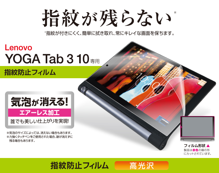 - Lenovo YOGA Tab 3 10の液晶画面を傷や汚れから守る、指紋防止・高光沢タイプの液晶保護フィルムです。