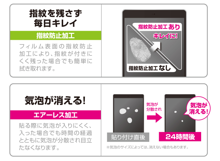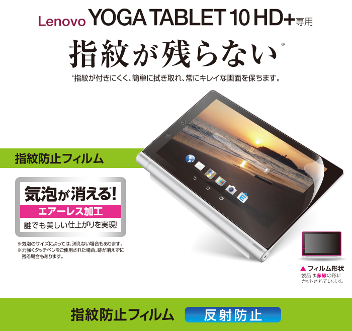 気泡がキレイに抜けるエアーレスタイプ。Lenovo YOGA TABLET 10 HD+の液晶画面をキズや汚れから守る、防指紋タイプの液晶保護フィルム。