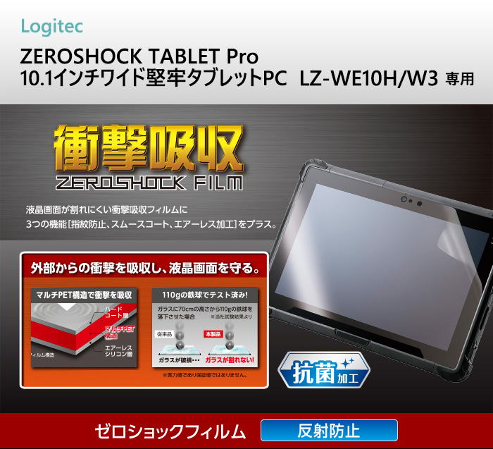 マルチペット構造が衝撃を吸収し画面を保護する、指紋防止・反射防止・抗菌タイプの一体型PC 耐衝撃タブレット(LZ-WE10H/W3)用画面保護フィルムです。