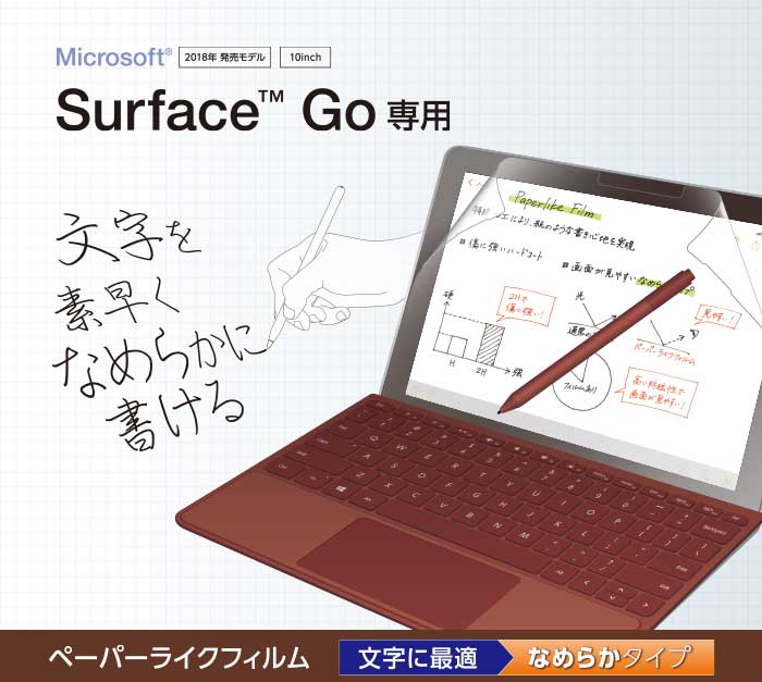 Surface Goの液晶画面を傷や汚れから守る、指紋防止紙心地反射防止タイプの液晶保護フィルムです。特殊構造により、適度なペンの沈み込みを実感できる「文字を書く」ことにこだわったフィルムです。